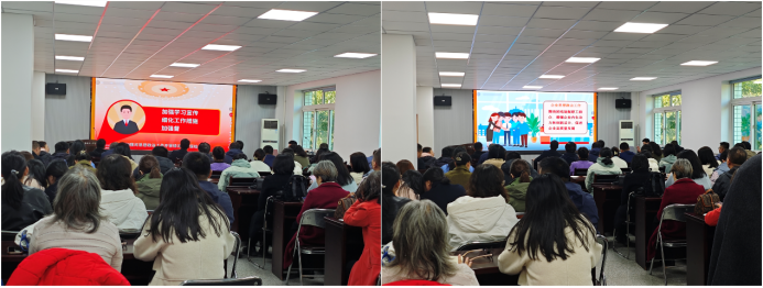 理论学习结束后,全体教职工集中观看《中国共产党思想政治工作条例》解读视频,进一步明晰思想政治工作的目标任务、职责分工与实践要求,为后续将条例精神落实到教育教学工作中奠定基础。