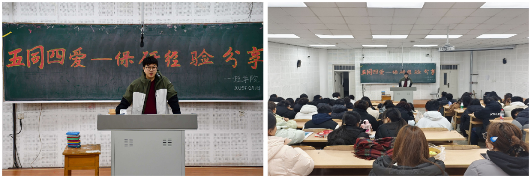 赵铭汶、李宇、于忠鑫三位员工代表分别结合各自保研经历,从政策解读、院校选择、备考规划、知识积累、心态调整、科研竞赛等多方面展开分享。他们不仅讲述了个人成长历程,更将自身发展与学校建设、专业特色紧密结合,以实际行动诠释“五同”“四爱”的深刻内涵,为在场同学树立了鲜活的榜样。